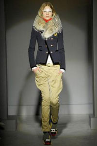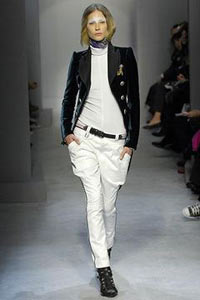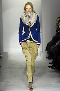 紧瘦的立肩学院小外套,狭细的低腰骑马裤,高校女生层层围裹的流苏方巾,配上科技运动感十足的便鞋,或是色彩明亮如同拼装玩具的高跟凉鞋,就是设计师首先交付的基本轮廓。接着还有五彩斑斓的拼缀连身裙,搭配毛领棉外套。听上去并不复杂,但其实囊括了东欧、印尼、日本、非洲、秘鲁、蒙古、巴厘岛……设计师所参考的不同种族地域可谓五花八门。于包罗万象之中理清头绪与方向,Ghesquière有一套自己的概念指南。巴勒斯坦围巾在他的早期系列中曾经有过使用,这一次变换了不同的印花,装点上了金色的丝线流苏,同时也成为翩然飘动的多片连身裙的一部分。为保持平衡,传统的西方风格也根植于系列中,英式剪裁的燕尾便服、花式斜纹软呢、运动衫条纹等等。而腰封在绵软的厚外套上的使用,将体形的勾勒推向了极致,最终紧紧地抓住了众人的视线与呼吸。