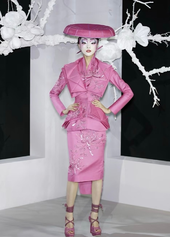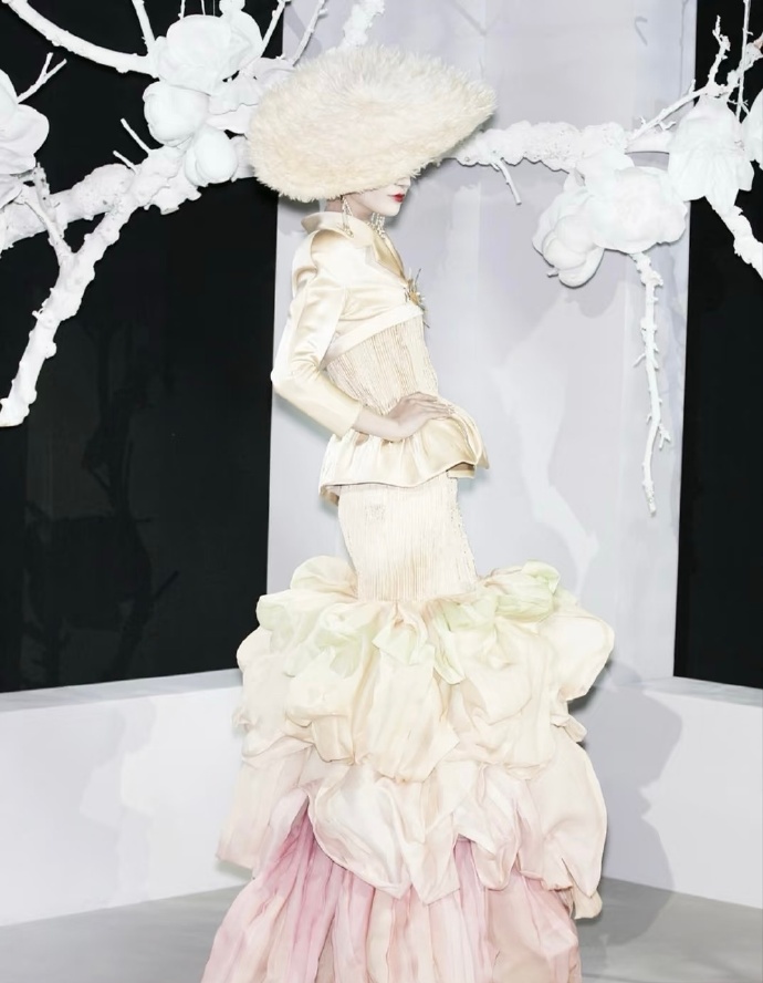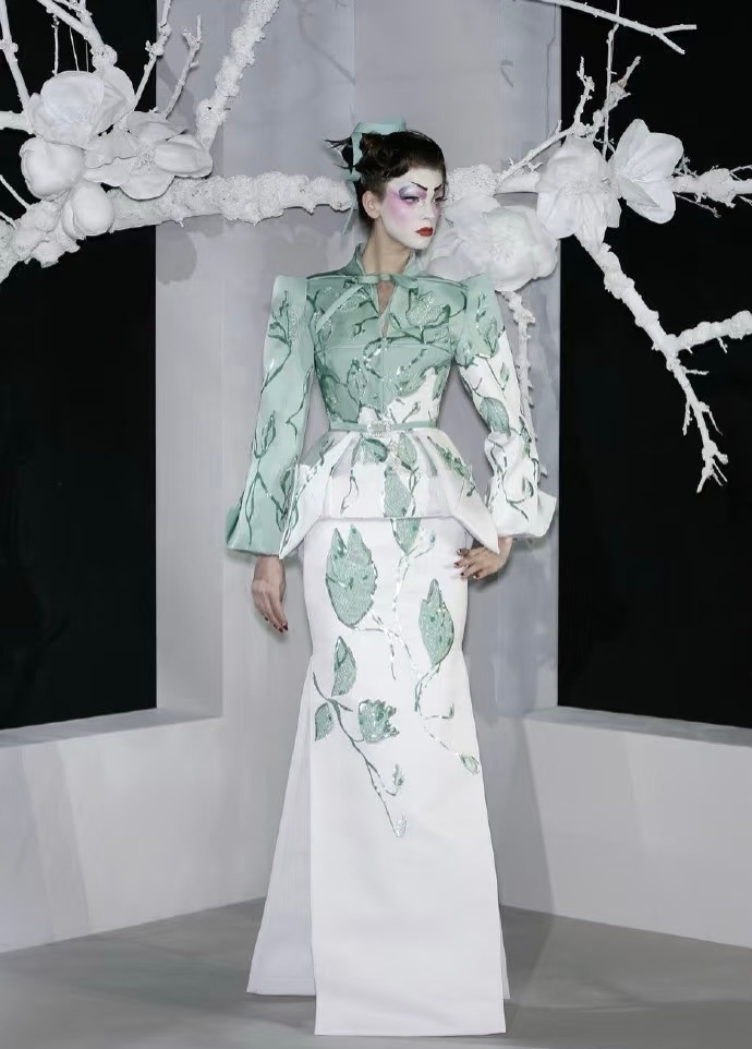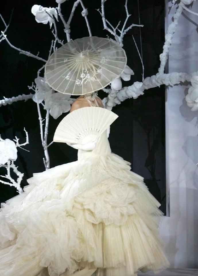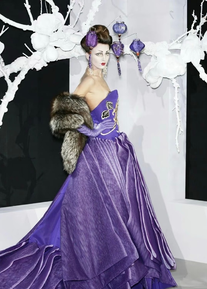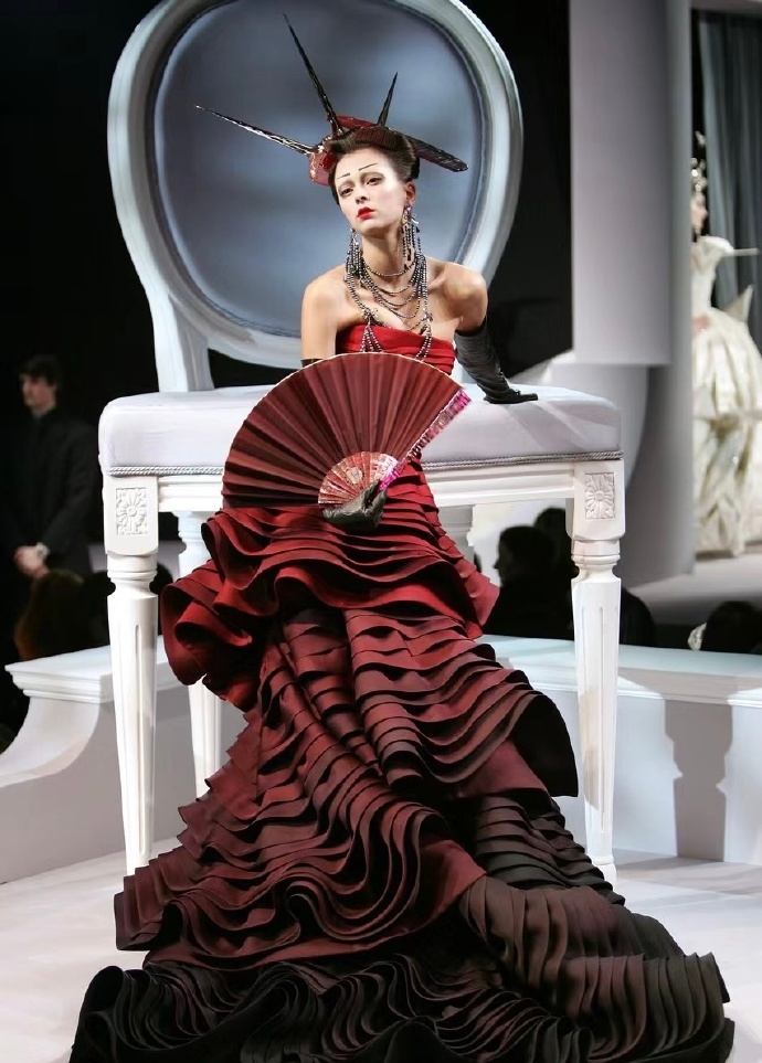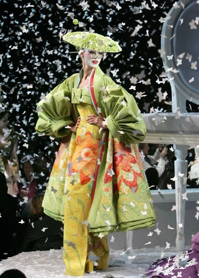 2007春夏高定秀场时尚的艺术盛宴海盗爷在Dior时期的巅峰之作灵感来源于歌剧《蝴蝶夫人》以高定的形式重新谱写艺妓的美,而且在设计中巧妙的融入了各种元素,折纸、编织、浮世绘、樱花、木梳、斗笠、木屐等展现戏剧风格和东方元素充满了东瀛风情,将艺术与时尚的融合至极致。向世界展现了一场充满惊艳和创意的时装盛宴。