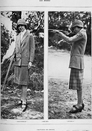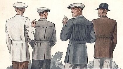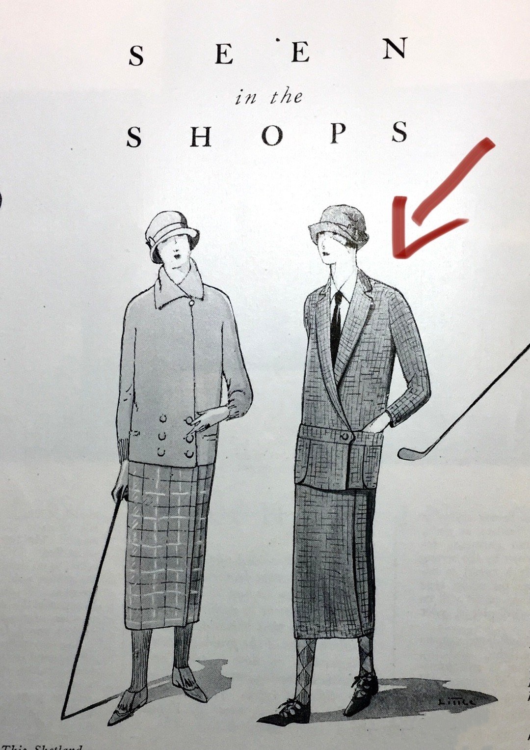 1920年代的时装插画,图1是一套典型的20年代廓形高尔夫套装,低腰直身的西装外套,无纽扣以及连身腰带的设计非常具有时代风格。