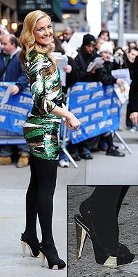 依旧是Kate Hudson,这次她脚蹬5英寸(约10厘米)的高跟鞋稳稳站立。这双Sergio Rossi(鞋业内的个中楚翘,意大利品牌)金黑色平台抽跟鞋将伴随她同David Letterman共赴深夜秀