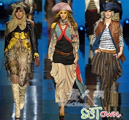 美国西部是本季另一个重要的灵感产地。Jean Paul Gaultier 为Hermes 塑造出了一个个沙漠烈女,用软皮式斯泰森毡帽搭配宽松舒适的狩猎装,仿如电影《Banditas》中的西部女盗贼般性感强势。Chanel层叠繁复的长裙搭配摇滚味十足的吉他,正是一副“都市游牧族”的经典造型。而Ralph Lauren所带来的优雅探险家形象,Givenchy皮革与丹宁布混合的酷感,以及Gucci钟爱的度假情结也都是体现西部风情的理想装扮。