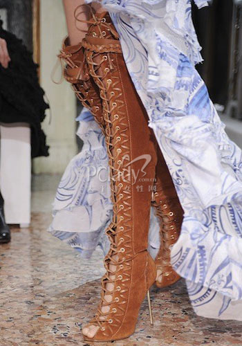 女人懂得露腿,说明她深谙性感之道。可就是有些设计师觉得要露不露才更胜一筹,这样捆绑式的高筒靴子以前也见过,但是高到膝盖以上的还真不多见。