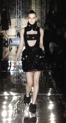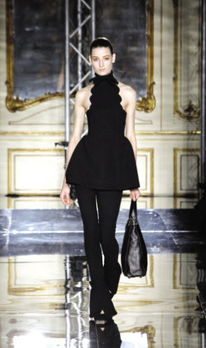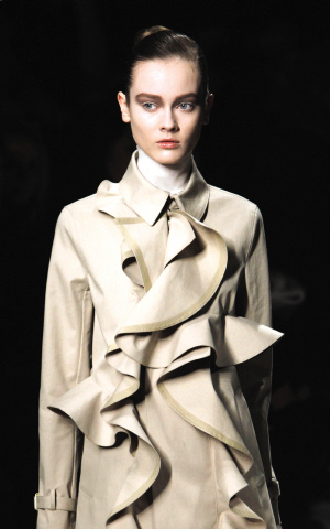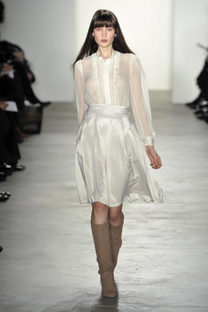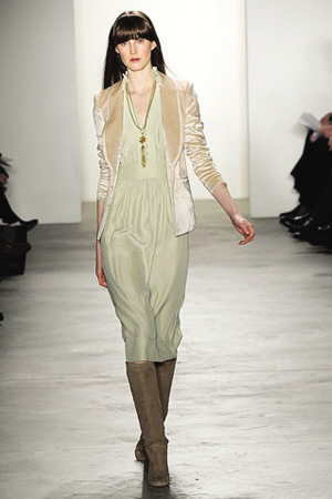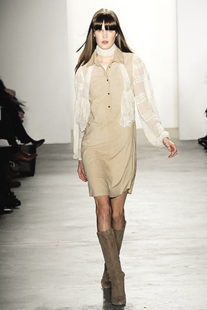 一直很少女的Erin Fetherston今年秋冬有大量雪纺与蕾丝装,柔和色为主的秀场,大量雪纺丝质过膝裙,配长靴的穿法,搭配直刘海长发,更像是以复古为主题。这样的裙装最适合搭配卡其风衣,在秋季相当养眼。