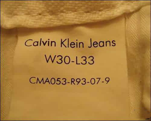 下面看洗标第三行,从第一个字母C开始,代表CK的缩写,第二个字母M代表男式服装,如果是女款的字母会是W,第三个字母A代表下装,上装好像是P,如果这个标字母部分就是错的,那显然是假的了,例如男式的衣服,结果标成了CWP-xxxxx,那么这个JS也太不专业了