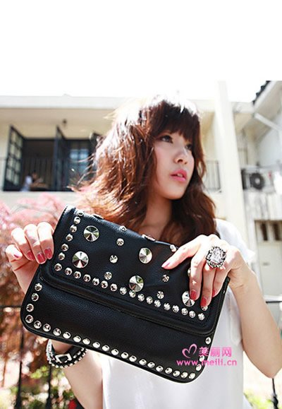 纤细迷你包身显得精致灵动,包身修饰了大小不同的圆形金属钉,摩登时尚,既可以斜挎又可以手拿,一包多用。