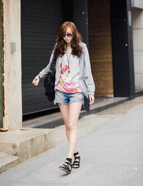 做旧热裤+复古衬衫+牛仔坡跟鞋