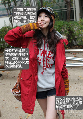 棉服外套没又羽绒服的膨胀感,但也会有少许臃肿。所以在红色选择上,一定要慎重。棉服比起大衣外套减龄效果绝对明显。韩系MM的搭配更是锦上添花。抓人眼球的红色,内搭灰色连帽卫衣,休闲感十足。