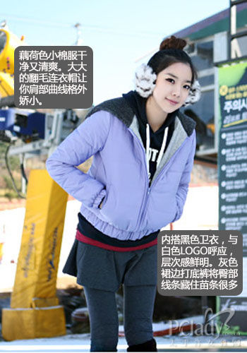 淡淡的紫色格外适合在下雪天穿着哦,非常融合白色调子的浅紫色,好似爱情浪漫的表述。温暖的棉服并没有增添上身的臃肿感。大大的翻毛连帽设计模糊肩部轮廓,让你看起来娇小很多,融入浅灰色的裙式打底裤色彩细条,还遮挡臀部线条。