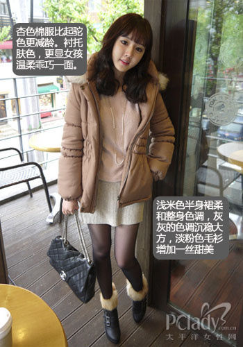 杏色最先女孩温柔一面,搭配其他服饰可算百搭单品,柔和的色彩与针织毛衫或是流行的毛裙绝对让你流露纯纯女人味,增添皮草元素也会非常融洽
