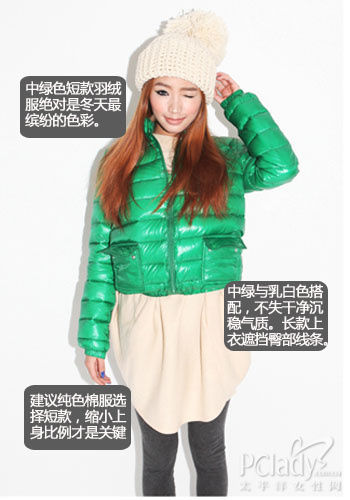 中绿色运用在羽绒外套上,动感味十足。搭配乳白色平衡绿色的冷色调,让整身更有温暖甜美感,短小的亮色外套是缩小上身比例的关键,内搭针织连身裙或是长款卫衣都是很好的单品。不仅藏下脂肪堆积的腰腹,还让下身色彩自然过渡。值得推荐的穿搭方法。