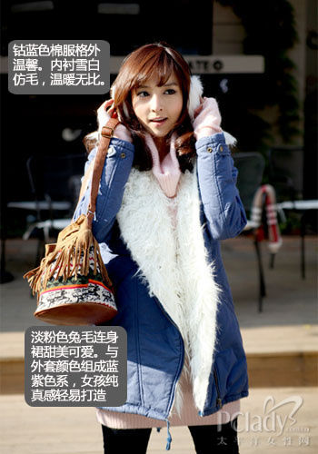 钴蓝色从来都有干净清爽的感觉,有着春天的烂漫。在冬天用钴兰色外套表达你的纯美情节再合适不过。大大的白色翻毛衣领,温暖加倍。内搭淡粉色兔毛裙子,你就是冬天最美的女孩。