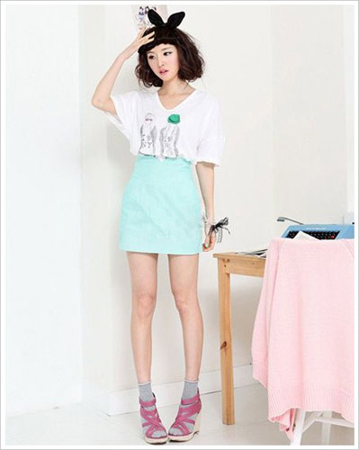 时尚点评:浅蓝绿色的高腰裙,收腰显高,裙摆处的宽松正好可以遮掩臀部的干瘪,制造出丰满的效果。如果不喜欢过于紧身的设计,那么这种有点花苞版型的短裙其实在丰臀上可以起到大作用。
