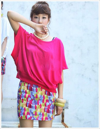 时尚点评:这样的印花窄短裙很有夏天的气息,紧实的版型可以修饰出臀部的曲线,重新划分身体比例,超短裙摆对显高有很好的效果,混搭玫红色蝙蝠袖的上衣,更增添了夏日的活力。