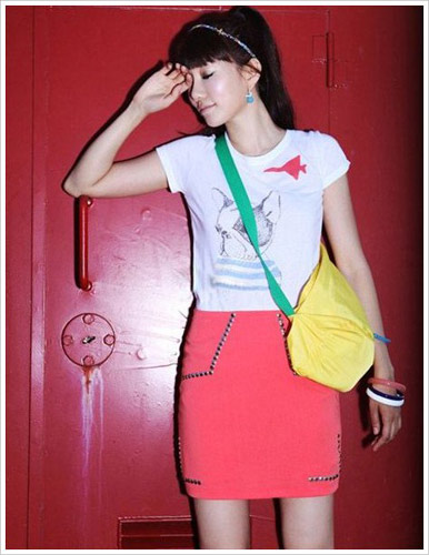 时尚点评:白T混搭高腰裙,是这一季街头风典型组合之一。橘红色的短裙,颜色饱满,具有动感和活力,精准的剪裁,裹出完美的腰臀曲线,搭配白T,舒适休闲,还可以轻松减龄。在炎炎夏日,不要惧怕用色,一个绿色肩带,黄色的布包,会给你带来更多的青春气息。
