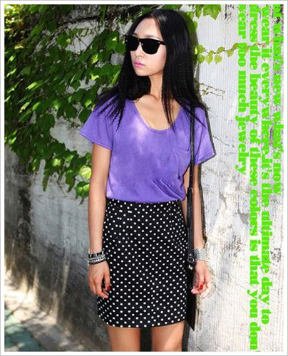 时尚点评:玫红色的短裙,在阳光灿烂的夏日,十分惹眼。贴合着身体曲线,修身的剪裁十分完美,所搭的灰T以红色修饰领口,与短裙粉色呼应,统一而和谐。但是假如你感觉自己长得有点“大妈脸”,就不要轻易尝试这样艳丽的粉色,容易显得土气。