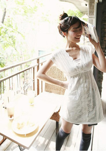 情景独白:与他约在夏日的午后,怀着忐忑不安的心情。还好出门前挑了这件白色连衣裙。深V领露出锁骨透出一点小性感,高腰的设计凸显胸部线条。配上深灰色长袜,保持了女孩的可爱感。这次约会一定顺利!