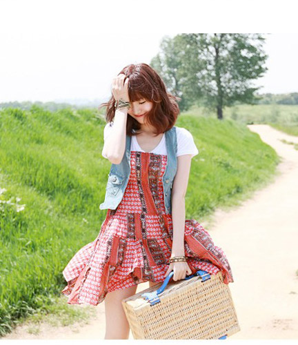 情景独白:突然约我出来野餐,会不会是他想给我个惊喜呢?为了配合今天的大好阳光,选择了红色印花的抹胸连衣裙,利用白色T恤打底,套上牛仔小马甲,是不是又帅气又迷人呢?