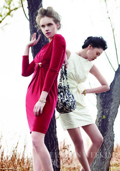 红色不对称连身裙 金色圆环手链 白色暗花蝴蝶结连身裙 金色多层细手链 黑白印花手袋 All by Anne Klein New York