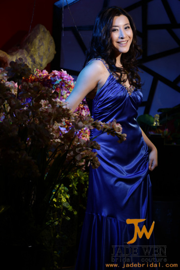 宝蓝色拖尾真丝礼服