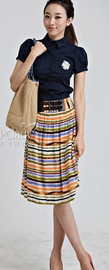 06 彩色条纹的棉质裙,带来夏日五彩缤纷的气氛,显得青春靓丽,搭配一件深色立领衬衫,立即变得优雅起来,穿进办公室,没有什么不可以!