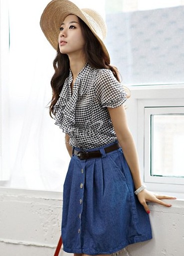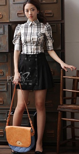 05 学院风的白衬衫,小巧的V领设计,饰以充满阳光气息的绿色蝴蝶结,俏皮极了,搭配深蓝色饰扣短裙,轻松给你减龄。