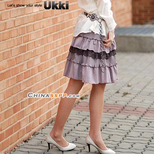 侧口袋设计加上斜裁荷叶边,军绿色迷你裙兼具酷感与可爱气质
