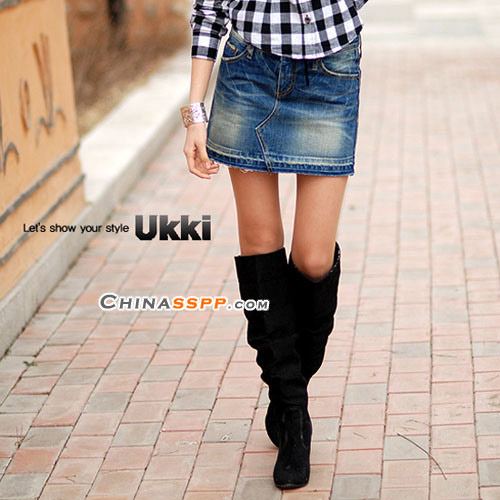 牛仔迷你裙搭配宽口高跟筒靴帅气又甜美