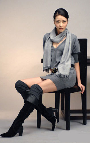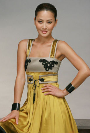 搭配Tips:光泽轻盈的雪纺展现性感本色,胸前的超大黑色盘结设计恰到好处地拉长视觉比例。过宽的脸部线条也得到完美修正。