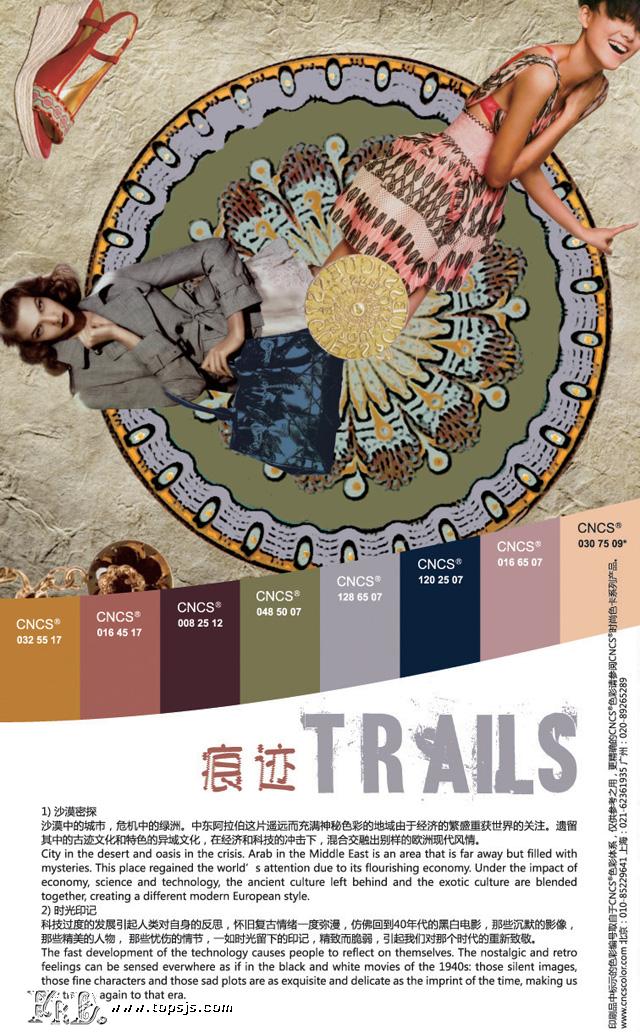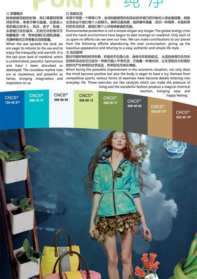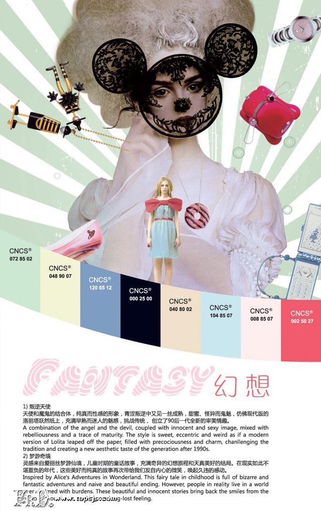 2011春夏女装设计及色彩趋势分为“幻想”、“汇流”、“痕迹”、“纯净”四大主题: