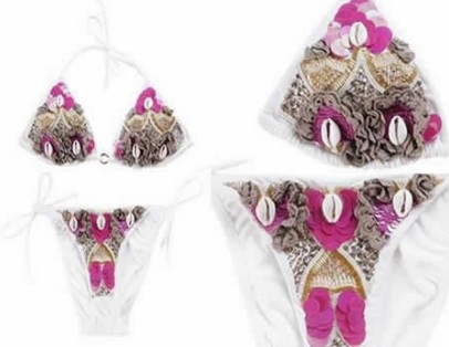 如果你喜欢全身佩戴施华洛世奇水晶,你一定也会对这些带这种水晶的比基尼感兴趣。穿上这种白粉色系鸡眼花边比基尼,你看起来像是在巴黎海滨浴场跳舞的脱衣舞女。这种比基尼先在意大利完成初步制作,然后运到印度进行手工加工,再回到意大利进行进一步的完善。它价值625美元。我相信这个价格对于这样一件奢华性感的比基尼来说并不是很贵。