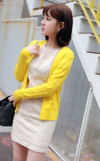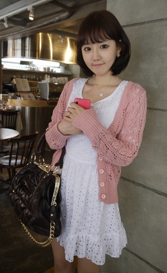不喜欢纯白的女生可以搭配这种鲜亮粉嫩的针织开衫。在清纯中增加一点俏皮的感觉。