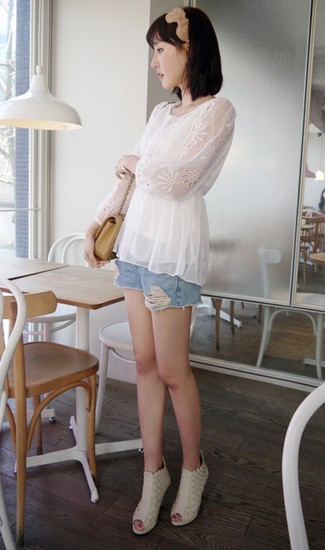 短款的蕾丝上装可以搭配短裤或者短裙,修长美腿与蕾丝构成性感无比的组合