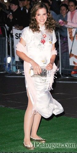 艾玛-沃特森的旗袍可说做工非常精致,银白色面料锈上可爱的红色和黄色小花朵,跳脱旗袍沉闷凝重感,非常适合艾玛的年纪,稍嫌不足的是她没有穿高跟鞋,显得小腿有些粗壮、整体姿态不够挺拔,不过可爱的笑容让人忽略了她的身材缺陷。