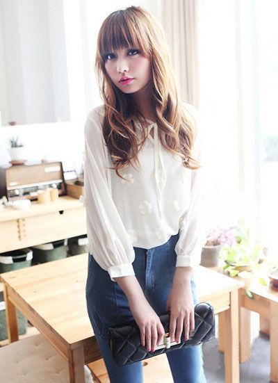 清凉搭配:花朵雪纺衫 + 牛仔高腰裙