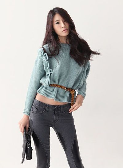 清凉搭配:花朵车边针织衫 + 牛仔拼接长裤