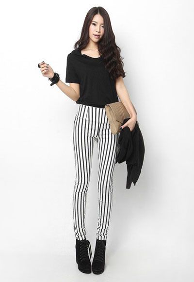 清凉搭配:黑色纯棉短袖 + 条纹紧身裤