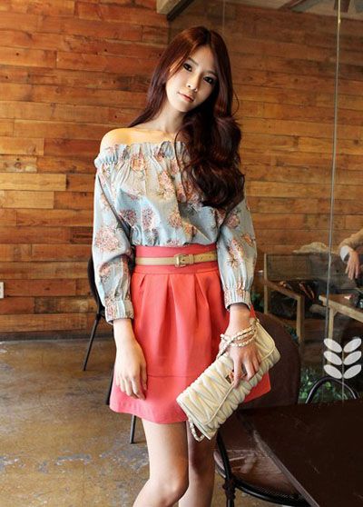 清凉搭配:碎花露肩上衣 + 西瓜红半身裙