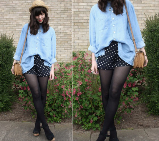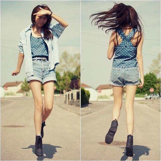 宽松水洗白牛仔衬衫当外套穿中性大气,做旧牛仔热裤随意个性,难得的整身牛仔搭配!