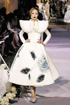 建筑学和服饰设计被设计师们完美地融合在了一起。几何图案的运用成了本季一道亮丽的风景线。除了简单的圆形、三角形、花朵、树木等一切来源于大自然的生命都被几何化。极富中国特色的云纹图样也被点缀在黑白灰三色的服饰上,颇有几分雅致。