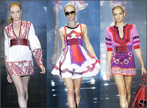 图4:Gucci的A型迷你裙,爬上膝盖好几英寸,还要绑上宽腰带。