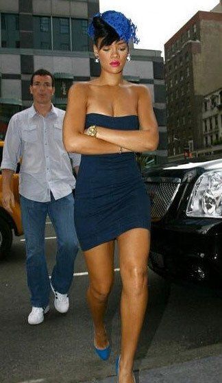 蕾哈娜也身着蓝色抹胸迷你裙登场,抹胸迷你裙这种上下都露的迷你裙,最适合有好身材大方露最爱露的辣妹啦。