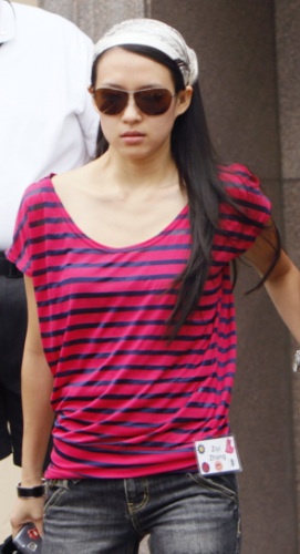 温岚 不但拿桃红色衣服与黑腰带配 更与黑BRA配