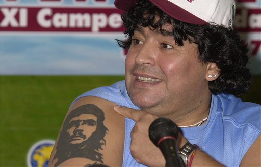 马拉多纳就是热爱文身的人,作为一个公开抨击社会不平等的人,马拉多纳多年以前就有了文身,他在自己的右臂上刻下了阿根廷著名革命家“切-格瓦拉”的头像。从照片中看,老马在展示这个刺青的时候非常自豪。至于他为什么选择刺一个革命家的图案,只能留给球迷们发挥想象力了。