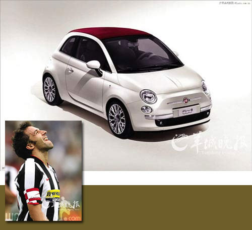 皮耶罗(意大利) 尤文属于阿涅利家族,阿涅利家族经营菲亚特车厂。因此这就是为什么皮耶罗驾驶菲亚特500的原因,虽然该公司是靠战后推广便宜好用的汽车而取得成功的。菲亚特公司去年给皮耶罗的是一辆独特的No10白色菲亚特,搭配他在球队的10号球衣。据说,这辆车还是菲亚特生产线上第10辆面世的产品。