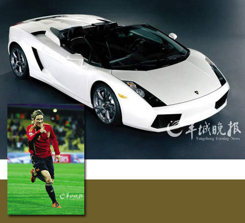 托雷斯(西班牙) 和普通人一样,足球明星们也喜欢给队友起绰号。在西甲贵为“金童”的西班牙射手费尔南多·托雷斯,到了利物浦后很快就得到另一个外号———“香蕉超人”,而托雷斯之所以成为"香蕉超人",并非因为他喜欢吃香蕉,而是因为他的一辆黄色的Gallardo Spyder 5.0MT跑车。