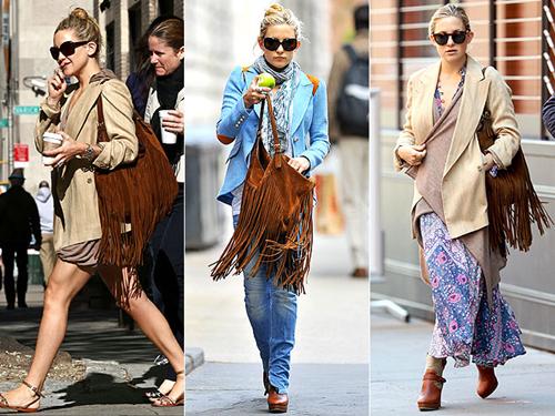 自从凯特莫斯示范流苏靴一举成名,流苏装,流苏包,流苏鞋,一切只要有流苏便能囊括时时尚精髓。从棕榈泉沙漠到曼哈顿大街,凯特-哈德森都穿着她最爱的拉夫-劳伦小山羊皮流苏包包,伴随着异国风情与神秘基调,带来洒落的时髦意味。