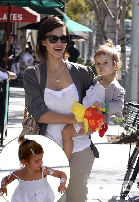 杰西卡-阿尔芭清爽短发精神百倍,可爱宝贝女儿奥诺满身贴纸,摔倒起身仿佛小青蛙。