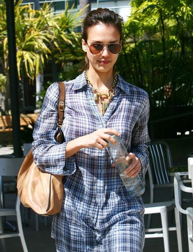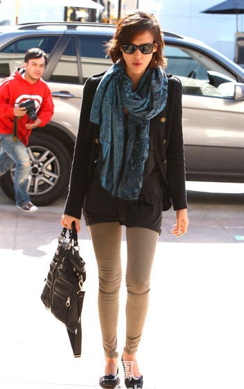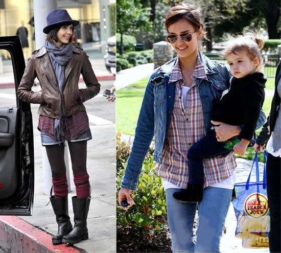 左图:杰西卡-阿尔芭俏丽短发亮相,皮革夹克配牛仔帅气十足。右图:牛仔外套搭配格纹衬衫,简约舒适,典型美国式搭配法。