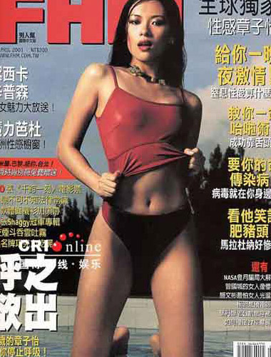 2001年4月号香港版《FHM》(男人帮)封面,刚刚走出《卧虎藏龙》剧组的章子怡惊艳变身,以及其性感撩人的姿态出现在男性杂志封面上。该期杂志一上市就被抢购一空。