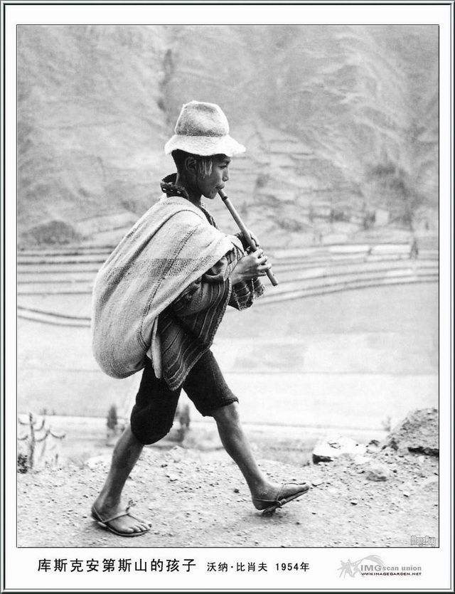 11 秘鲁,通往库斯克的山路上,男孩吹起了短笛。这是一幅田园牧歌的小景。国际摄影记者比肖夫拍了许多感人的儿童照。他把孩子们当做美好未来的象征。比肖夫是个耽于幻想的人,想看到世界重归于文明,认为摄影会指明达到这一理想的途径。他报道过朝鲜战争,也报道过印度支那战争。然而,他更喜欢的题材还是家庭和社交生活,因为这些题材诉说着延续性。他不喜欢极权主义者们赞赏的那种翻天覆地的革命。他拍了许多乐师、舞蹈者和一些古风犹存的社团的文化生活。他在传统的倭国发现了这种古风犹存的范例,并以此为主题作成一部重要的书,于1954年出版。同年,比肖夫在安第斯山区一次车祸中遇难,时距拍摄这幅照片不久。